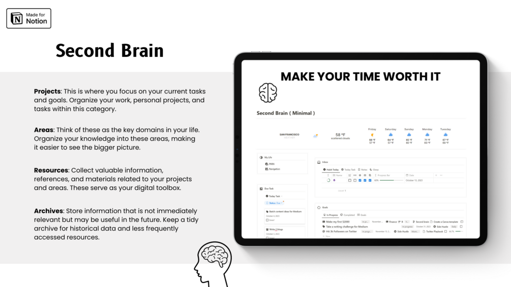 • Second Brain Template: Turn Notion into your ultimate knowledge hub. Inspired by Tiago Forte's methods, this template lets you centralize notes, ideas, and projects for effortless recall and creativity.