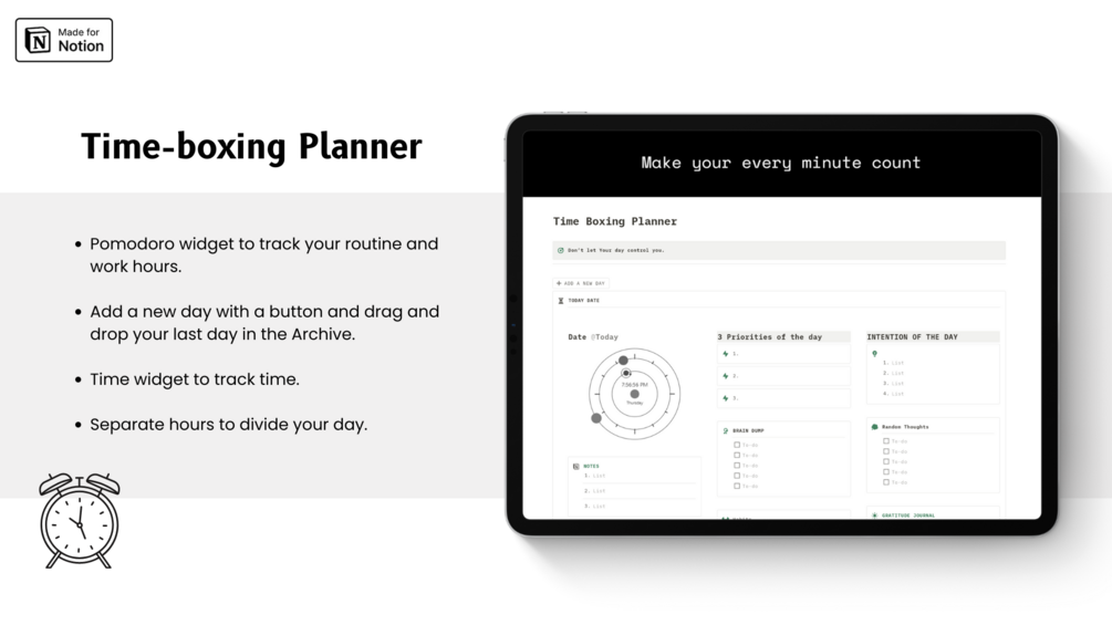 - Time-Boxing Planner: Dive into laser-focused productivity. Break down your day into manageable time blocks and conquer your most important tasks with total concentration.