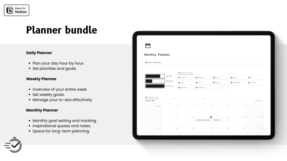 • Planner Bundle (Daily, Weekly & Monthly): Stay organized across all timeframes. This comprehensive bundle lets you plan your daily schedule, manage your week, and set long-term goals with ease.